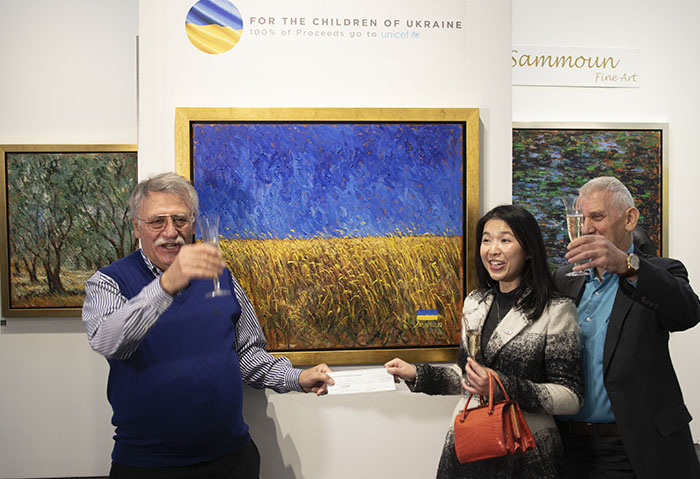 - Samir Sammoun of Sammoun Fine Arts, a Redwood Art Group exhibitor for more than 20 years, proved to be one the most successful exhibitors with pieces placed that included “Parasols Rouge” at $4,750; “La Printemps” at $15,750; “CypressSoliel II” at $15,750; “Champ de Ile” at $16,750; “Elegance” at $8,850; “Au Bord du St-Laurent” at $6,000; “September in the Mediterranean Shore” at $4,750; “Sunrise on the Beach” at $4,750; “Music” at $5,100; “Wheat Field Study” at $2,600, and his “Peace” for proceeds donated to UNICEF, that sold for $15,750.