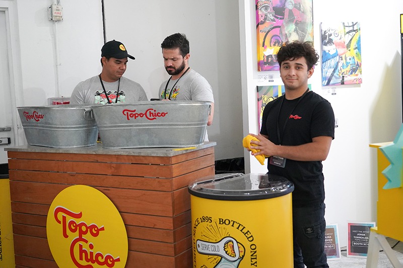 - Topo Chico made you look with the unexpected and daily live demonstrations. Guests sipped a Topo Chico water while watching artists DaveL, Corey Pane, Jenna Efrein, and Natasha Tomchin create their next work of art.